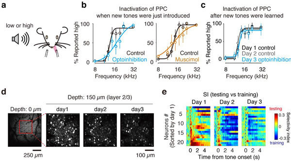 圖注:a, 聽覺二選一抉擇任務(wù)。b, 后頂葉皮層失活影響對(duì)新聲音刺激的抉擇。c, 后頂葉皮層失活不影響對(duì)已學(xué)會(huì)聲音刺激的抉擇。d, 對(duì)同一群神經(jīng)元進(jìn)行長時(shí)程鈣成像記錄。e, 同一視野中所有神經(jīng)元對(duì)訓(xùn)練(熟悉)和測試(陌生)聲音刺激之間的選擇性。選擇性指數(shù)(selectivity index, SI)基于ROC分析,SI > 0 表示偏好測試聲音刺激,SI < 0 表示偏好訓(xùn)練聲音刺激。