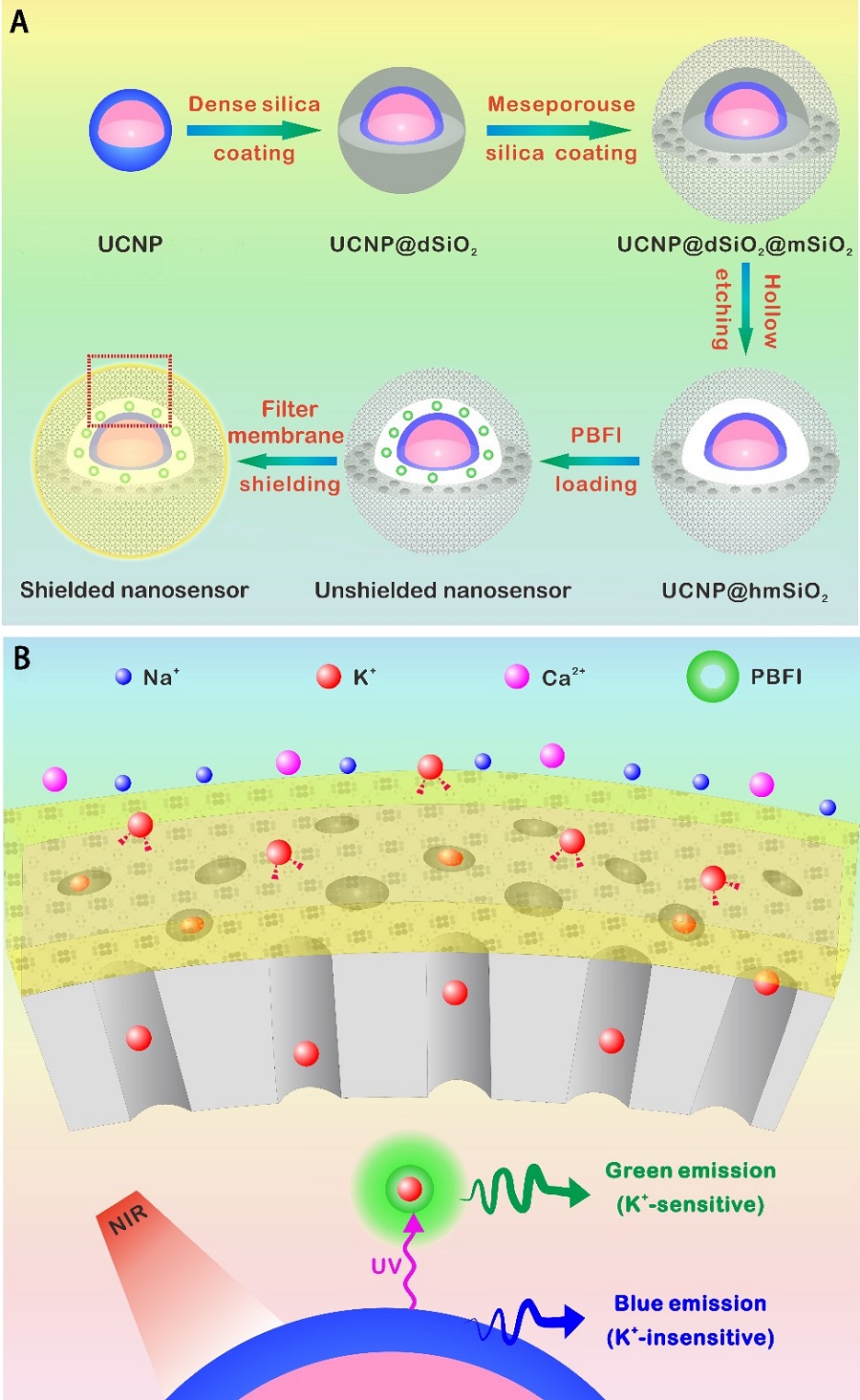 圖注:鉀離子納米探針的設計以及感應機理。(A) 鉀離子納米探針的制備過程。上轉換發光顆粒NaYF4:Yb/Tm@NaYF4:Yb/Nd 表面連續包裹一層實心二氧化硅和一層介孔二氧化硅。刻蝕實心二氧化硅成留下的空腔結構可裝載鉀離子熒光指示劑。最后,外表面包裹一層鉀離子特異性的薄膜即成鉀離子納米感應探針。(B) 鉀離子納米探針的感應機理。外層薄膜只允許鉀離子進出納米探針,同時排斥其他陽離子。在近紅外光激發下,內核上轉換發光顆粒發出的紫外光可作為鉀離子熒光指示劑的激發光,從而賦予探針近紅外光激發的功能。