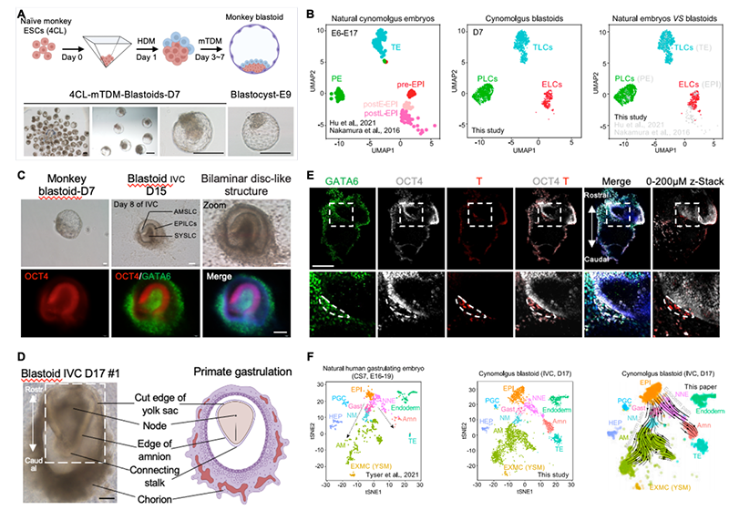 1.A)非人靈長類食蟹猴類囊胚體外重構。(B)scRNA-seq分析體外重構的非人靈長類食蟹猴類囊胚的細胞譜系構成。(C)非人靈長類食蟹猴類囊胚體外延遲培養至D15時形成的雙層胚盤樣結構。(D)非人靈長類食蟹猴類囊胚體外延遲培養至D17時形成的原腸胚樣結構。(E)非人靈長類食蟹猴D17類胚胎的形態學染色。OCT4, EPI marker. GATA6, amine marker. T(Brachyury), gastrulation marker. (F)非人靈長類食蟹猴D17類胚胎的單細胞轉錄組分析和發育路徑分析