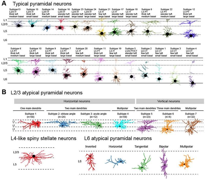 為了研究這一問題,嚴軍研究組在此前工作的基礎上重構了1920個神經元的樹突形態(圖1),其中包括1515個典型錐體神經元樹突和405個非典型錐體神經元樹突。通過精細定量刻畫樹突的形態和聚類分析,研究人員發現了24種類型的典型錐體神經元樹突以及多種非典型錐體神經元樹突(圖2)。