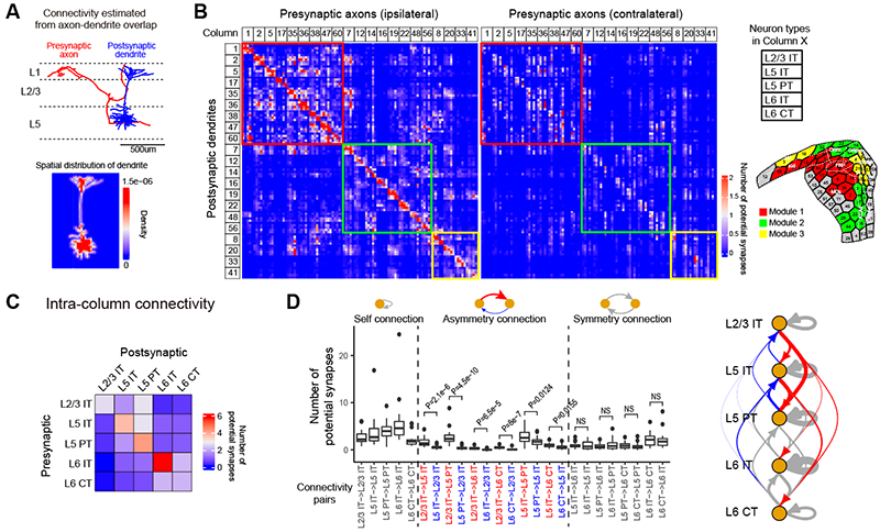 圖4 基于樹突和軸突形態構建和分析前額葉皮層聯接網絡。(A)計算兩個神經元之間潛在聯接的示意圖。(B)前額葉皮層不同類型神經元之間的聯接網絡。(C)同一個“皮層柱”內不同類型神經元的聯接模式。(D)神經元類型之間聯接對稱性的分析和結果示意圖。