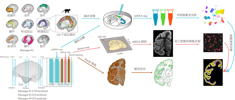 圖1. 總體實(shí)驗(yàn)設(shè)計(jì)。利用Stereo-seq技術(shù)采集了3只獼猴左半腦的161張厚度為10微米切片的空間轉(zhuǎn)錄組數(shù)據(jù)。同時(shí)利用顯微切割結(jié)合單細(xì)胞核轉(zhuǎn)錄組測(cè)序技術(shù)了獲得了百萬級(jí)別的獼猴大腦皮層單細(xì)胞核轉(zhuǎn)錄組數(shù)據(jù)。通過單細(xì)胞核轉(zhuǎn)錄組和空間轉(zhuǎn)錄組整合分析,繪制了食蟹猴大腦全皮層的三維單細(xì)胞空間分布圖譜。