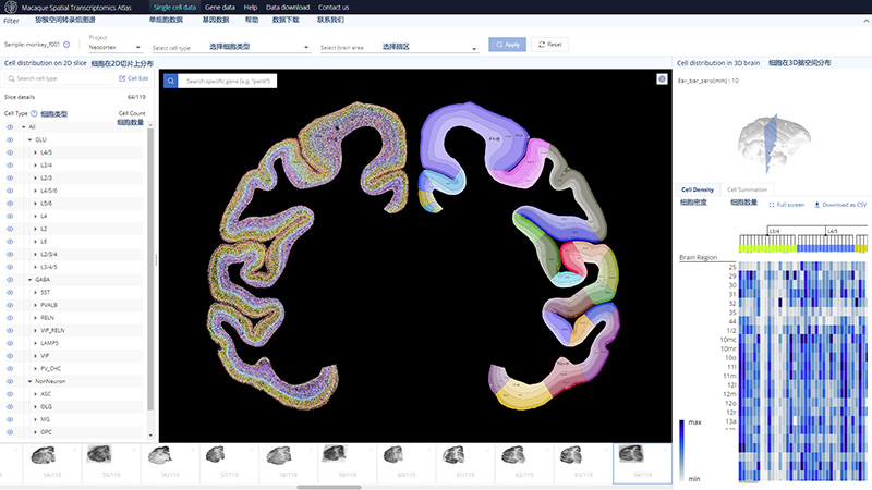 該研究產(chǎn)生了較為完整的世界首套獼猴全腦皮層的單細(xì)胞以及空間轉(zhuǎn)錄組數(shù)據(jù),為后續(xù)相關(guān)研究提供了重要的數(shù)據(jù)資源庫(kù),現(xiàn)已實(shí)現(xiàn)公開共享(https://macaque.digital-brain.cn/spatial-omics)(圖3)。