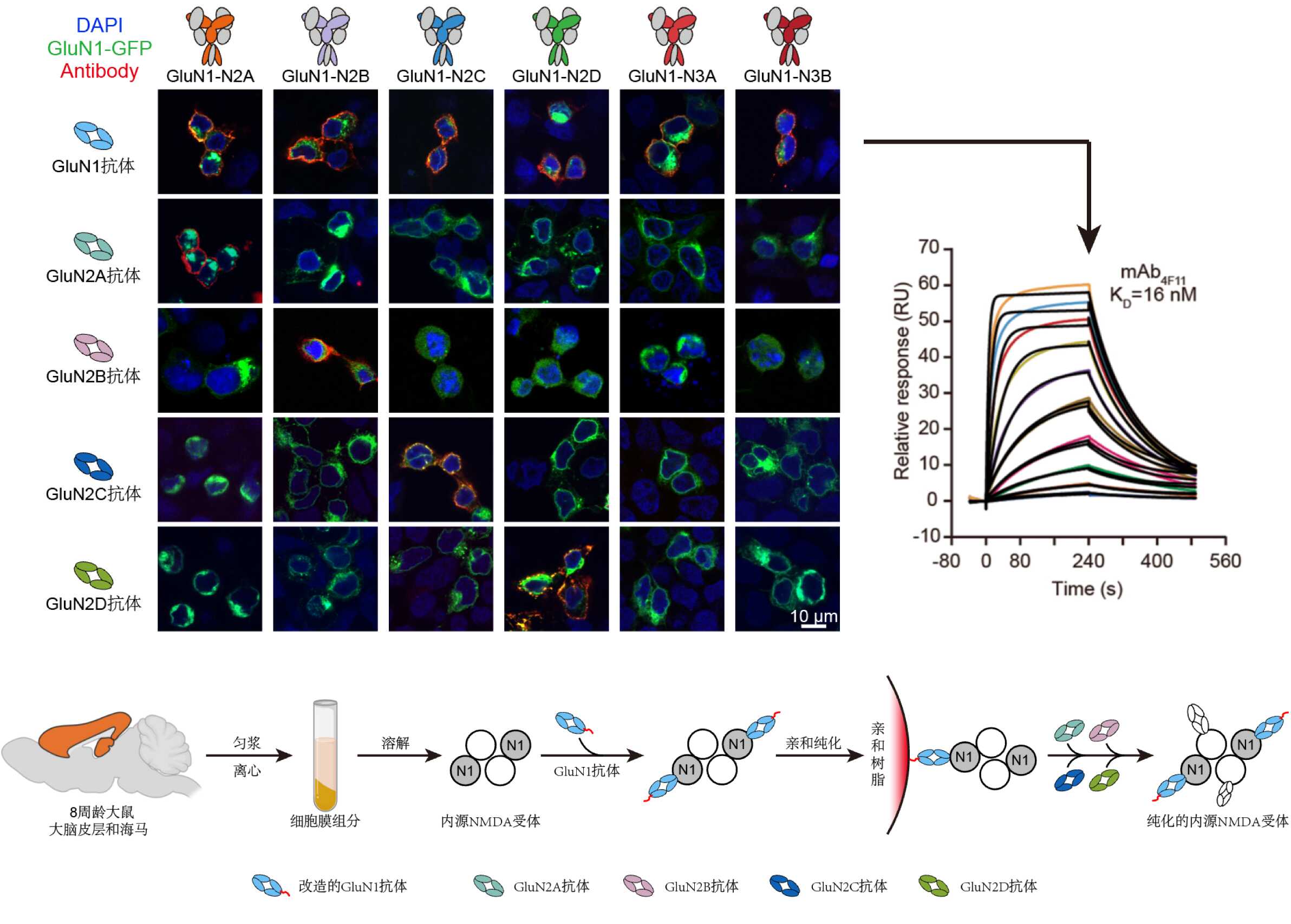 2. 靶向NMDA受體亞基的高親和力單抗的開發和內源NMDA受體的富集純化策略。雜交瘤技術及活細胞熒光成像方法制備及鑒定結合不同NMDA受體亞型的單克隆抗體。利用納摩爾級別的GluN1單抗純化出皮層海馬中內源NMDA受體,并加入構象特異性和亞基選擇性的GluN2抗體進行標記及分析。