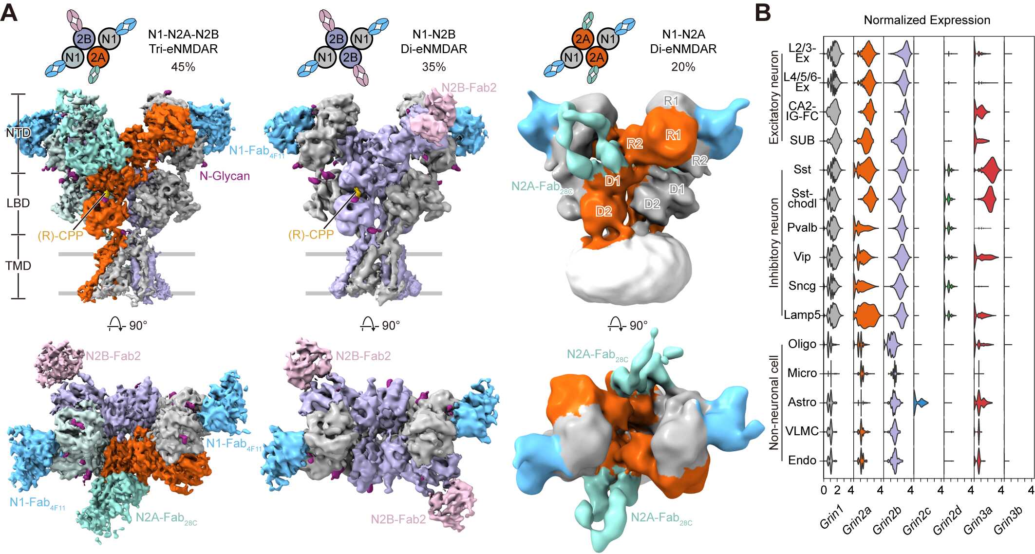 通過冷凍電鏡(cryo-EM)技術,團隊從皮層和海馬中的內源NMDA受體解析出了3種主要的受體亞型:GluN1-N2A-N2B三異四聚體,GluN1-N2BGluN1-N2A二異四聚體,分別占據45%35%20%的比例(3)。該研究表明GluN1-N2A-N2B三異四聚體是內源豐度最高的亞型,強調了GluN2AGluN2B亞基在生理狀態同一受體中的功能整合。更新了領域內三十年來認為發育關鍵期(developmental switch)是從GluN1-2B轉變為GluN1-2A的觀點,應修正為從出生時GluN1-2B轉變為成年的GluN1-2A-2B, GluN1-2BGluN1-2A三種亞型共存的結論。