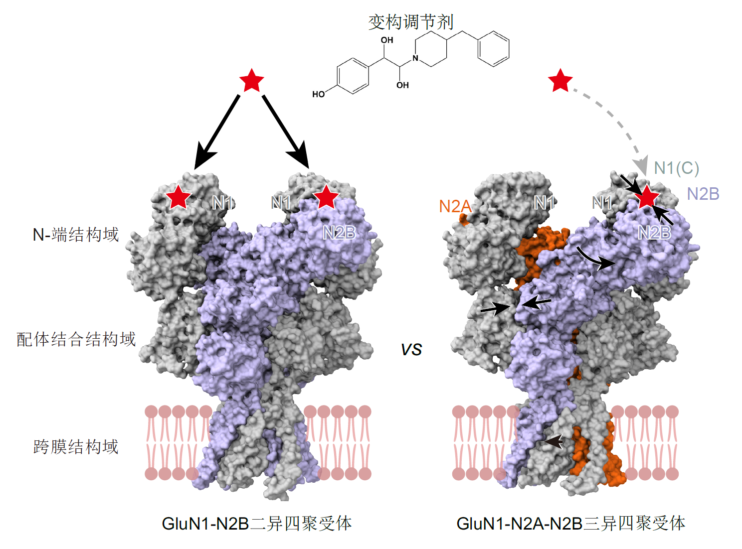 研究團隊進一步通過結構對比發現了GluN2B亞基在GluN1-N2A-N2B三異四聚體和GluN1-N2B二異四聚體中的構象區別,揭示了同一亞基在不同受體中存在構象差異,將決定不同亞型的生物物理學、藥理學和通道開放屬性(4)。不同內源NMDA受體間的構象差異,為理解內源NMDA受體的功能多樣性,以及不同受體的藥理差異提供了分子基礎。該發現為設計具有亞基特異性且具有亞型偏好性的化合物提供了可能,有助于提高NMDA受體藥物的靶向性。